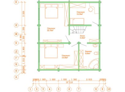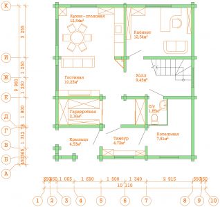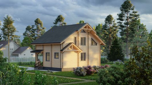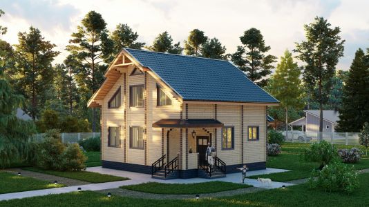 Современный двухэтажный дом из профилированного бруса. Из-за своей огромной площади и статности его можно вполне величать как «Замок из профилированного бруса». Двустороннее крыльцо на углу дома элегантно вписывается в дизайн и являет собой начало пути в вереницу просторных комнат и залов этого дома из бруса. Свет и уют — вот, что характеризует пространства этого замечательного дома. Ну и, конечно же, внутреннему убранству не уступает прочный и стильный фасад здания.